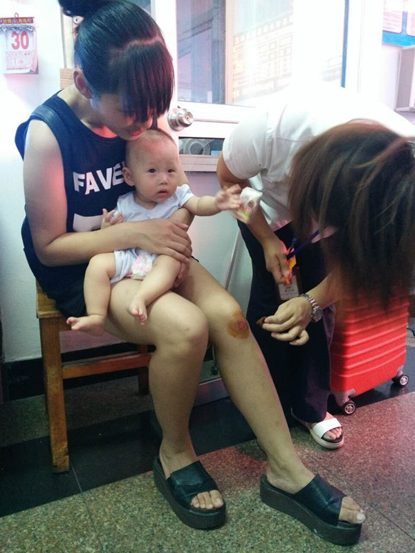 正當(dāng)王月梅拿起水杯準(zhǔn)備喝口水潤潤喉的時候,她一抬頭發(fā)現(xiàn)售票窗口前,有一名年輕女子表情痛苦地單腳跪地,手里抱著一個大聲哭泣的嬰兒,在她的不遠(yuǎn)處還散落著一些衣物。王月梅見狀,趕忙跑出服務(wù)處。經(jīng)詢問得知,原來這位年輕的媽媽因為著急要趕13:35到松溪的班車回老家,想快一點到候車室,結(jié)果走得急,不慎摔倒了,膝蓋擦破了一大片,汗水流過傷口,疼痛難忍。