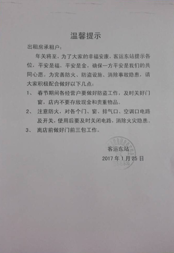 一行人對東站站場和出租房的消防設(shè)施、用火用電情況進(jìn)行了逐一檢查。要求工作人員加強(qiáng)安全防范,特別要注意春節(jié)期間的用火用電安全,下班后要及時(shí)切斷電源。并向周邊承租戶發(fā)出春節(jié)期間的溫馨提示,要求各承租戶在結(jié)束營業(yè)后對店內(nèi)的用水、用電進(jìn)行仔細(xì)檢查,確保消除安全隱患,平平安安、快快樂樂的過春節(jié)。