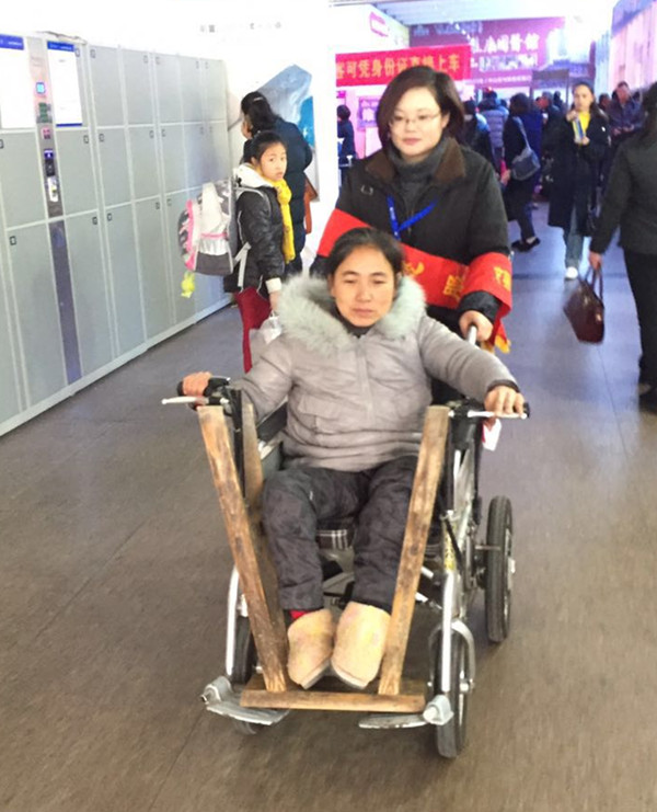 3月1日12點(diǎn)左右,正值出行高峰,售票廳里人頭攢動(dòng),買票的長(zhǎng)隊(duì)緩緩挪動(dòng)著。一位中年女性乘客,身穿灰色棉衣,頭頂?shù)念^發(fā)有些斑白,被人群擠到了一旁。她雙手搭在輪椅的扶手上,費(fèi)力地往售票窗口前行。