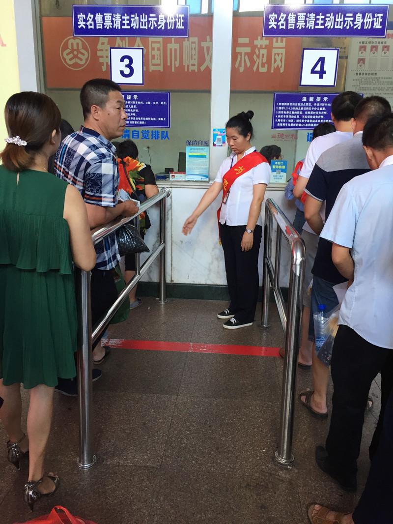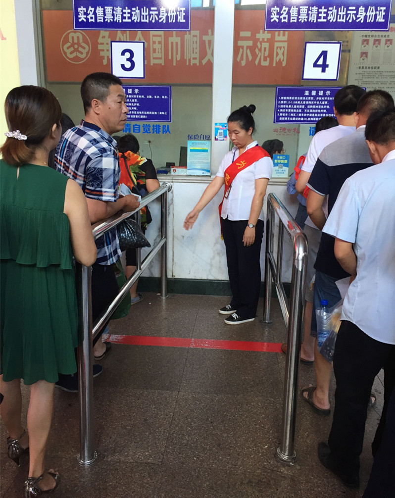 “您好!請(qǐng)不要越過紅線,請(qǐng)站在一米線后等待,”售票廳里尤麗娟正耐心地對(duì)正在排隊(duì)買票的旅客進(jìn)行勸導(dǎo)。