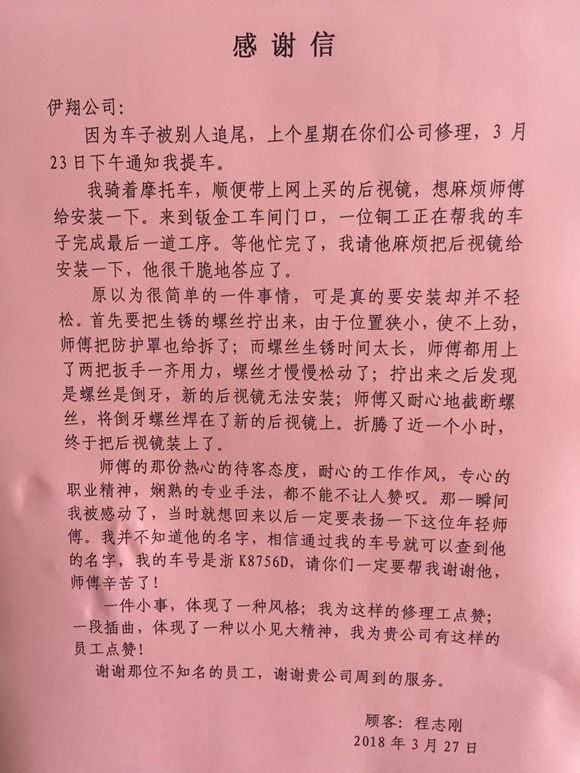 3月27日,伊翔公司總經(jīng)理室收到一位客戶的感謝信,感謝公司售后服務(wù)部鈑金組員工鐘文軍師傅的熱心幫忙和周到服務(wù)。