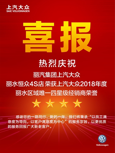 麗水恒眾公司在全國(guó)一千多家經(jīng)銷商中脫穎而出,喜獲“上汽大眾四星級(jí)經(jīng)銷商”榮譽(yù)稱號(hào) 。麗水恒眾公司開業(yè)首年就能取得如此成績(jī)實(shí)屬不易,2018年公司在全體員工的共同努力下,新車銷售量、售后服務(wù)臺(tái)次、客戶滿意度、DCDA檢查、售后AuditⅡ檢查均達(dá)到廠家要求的四星標(biāo)準(zhǔn)。這是對(duì)恒眾全體員工2018年各項(xiàng)工作的肯定和勤懇工作的回報(bào)。