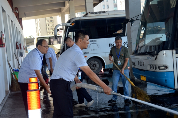 “一二三,加油……” ,“這里有一堆垃圾,快點(diǎn)拿掃把過來……”。為深入推進(jìn)創(chuàng)建文明城市,不斷提升社區(qū)環(huán)境面貌,迎接“國慶70周年”和文明城市測評,9月23日下午,長運(yùn)(東站)組織員工開展衛(wèi)生大清掃活動(dòng),清理站區(qū)內(nèi)垃圾?;顒?dòng)中,大家手拿掃把、鋤頭和垃圾鉗,運(yùn)用消防水帶,重點(diǎn)對站場地面油污、綠化帶上的雜草、垃圾桶臟污破損等問題,進(jìn)行了全面排查和清理。她們相互協(xié)作,或清除路面的煙頭雜物,或徒手將雜草和泥土裝運(yùn)上車……不一會兒,大家的衣衫都被汗水浸濕,但勞動(dòng)熱情依然十分高漲。經(jīng)過近兩個(gè)小時(shí)的全力奮戰(zhàn),侵占道路的垃圾、雜物全部被清理干凈。